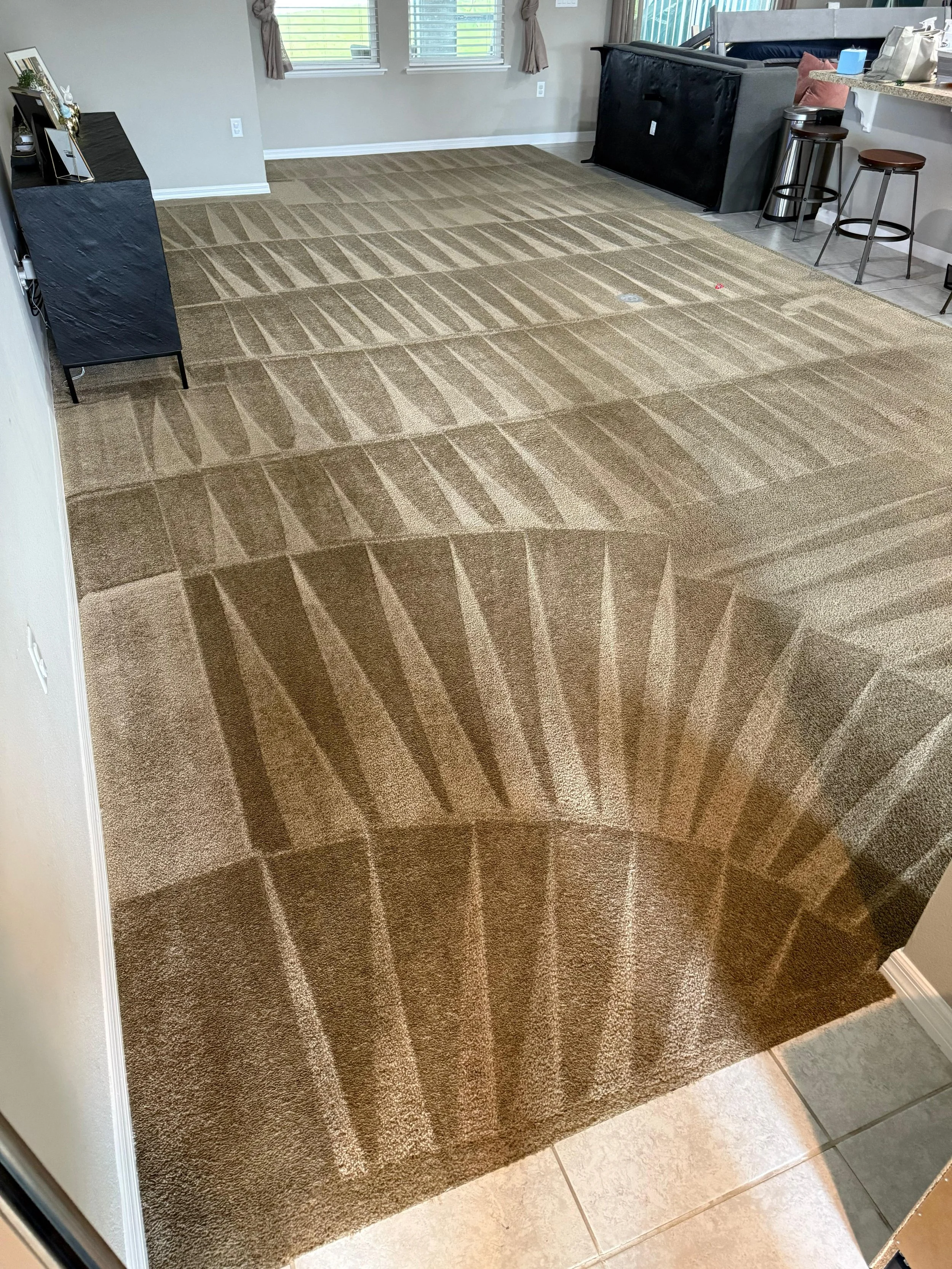 Typical dry times are about 8–10 hours for carpet and 6-8 hours for upholstery, depending on fiber type, humidity, and airflow. Orlando’s climate can slow drying, so we recommend running A/C and ceiling fans to speed things up after your carpet cleaning service.